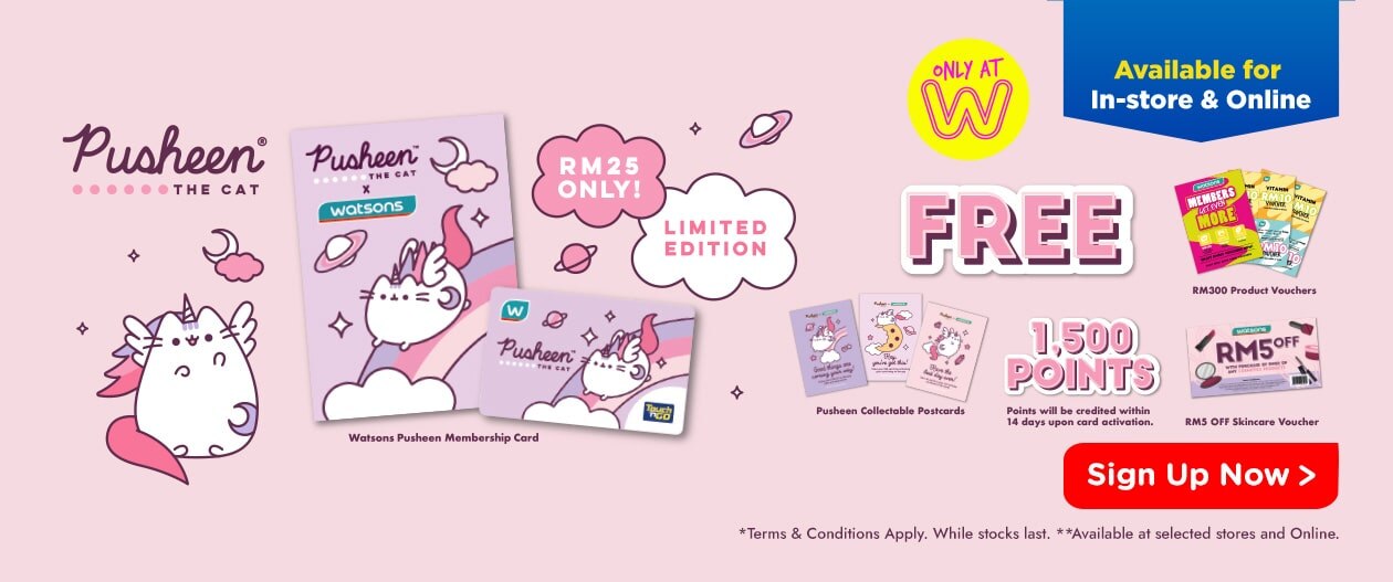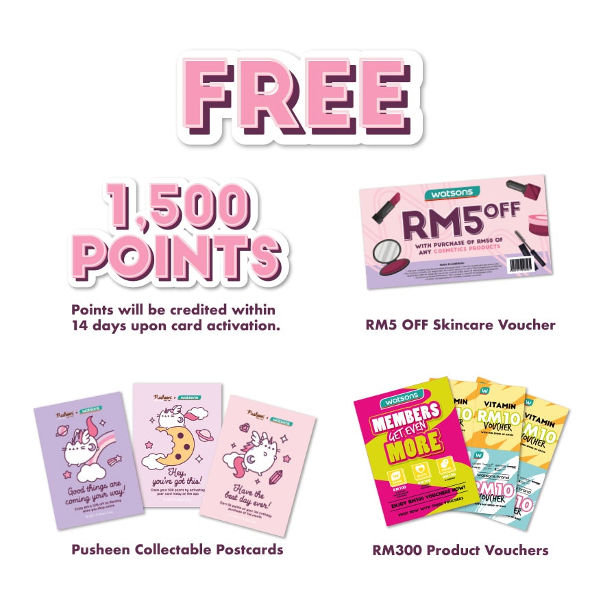 这一款与Pusheen合作的会员卡售价在RM25~购买这张卡除了得到可爱的会员卡之外,还附送1500积分,另外还有3张Pusheen明信片以及RM5的Skincare折扣券和RM300的产品优惠券~